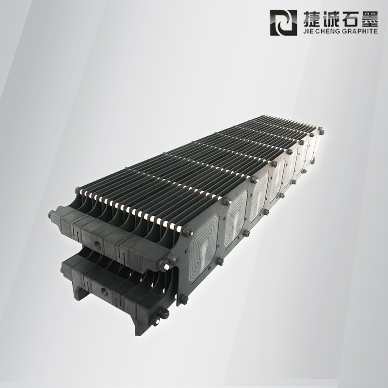 石墨舟為槽形石墨舟,包括一個或多個具有兩個相對的槽面和底部支撐突起的傾斜槽、底面、上端面、內側面、外側面和與上端面相對的止口。在相對的兩個槽面上分別設計有至少一個排氣通槽,在底部支撐突起與相對的兩個槽面的相交處分別設計有角度保護槽。底面上任意兩個相鄰的W形雙向滑槽形成的凸起的下部設計有與向斜槽平行的貫通槽,該貫通槽的橫截面大致為λ形。本實用新型能夠在氫氣脫膠和真空燒結過程中對硬質合金帶材產品進行均勻脫膠,避免產品翹曲變形,產品裝載量大,耗材少。