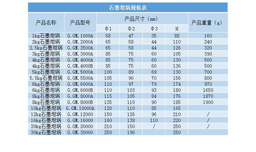 以上是一些石墨坩堝的規格,對應型號的石墨坩堝價格可以來電咨詢,給到更實惠的價格。